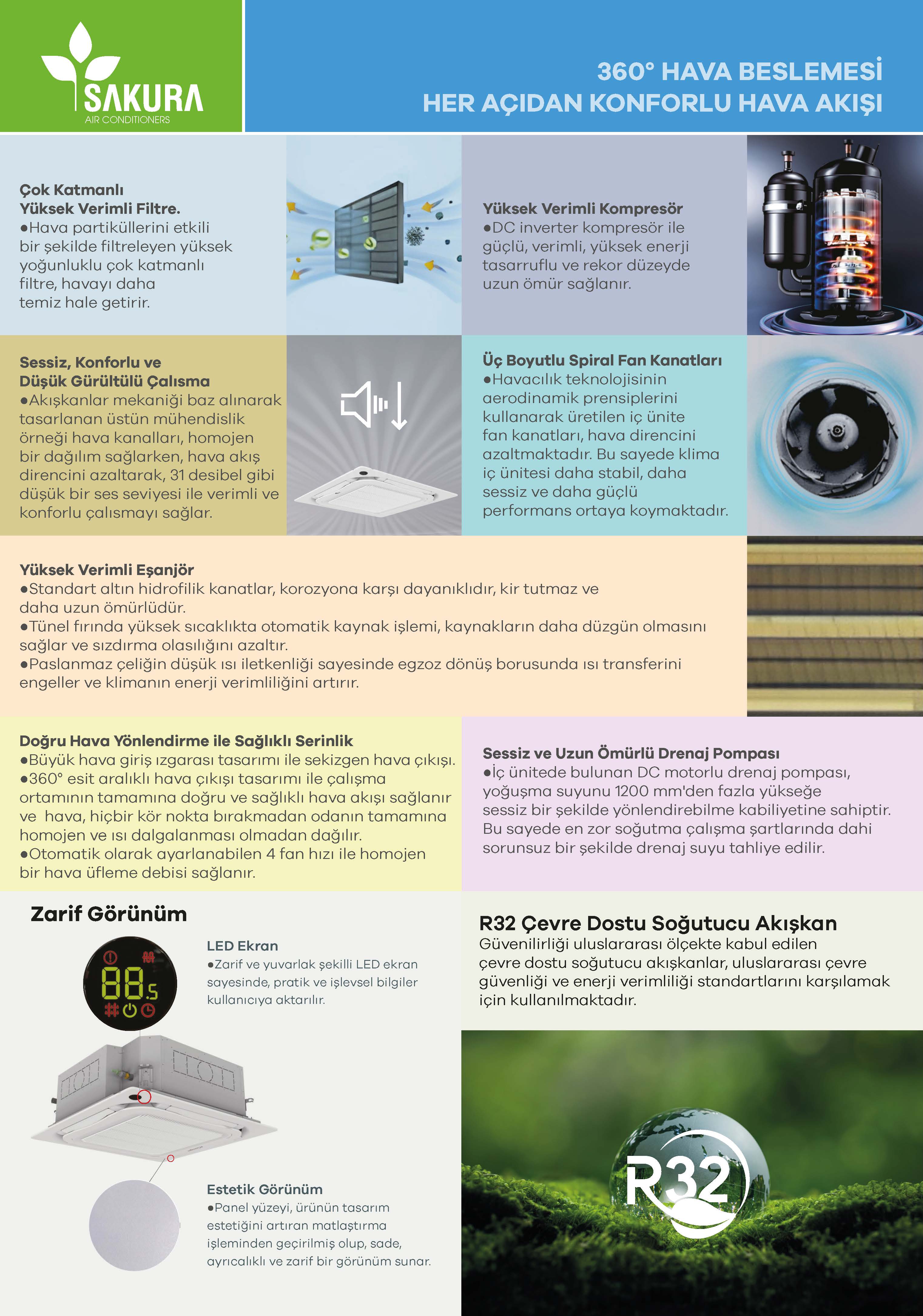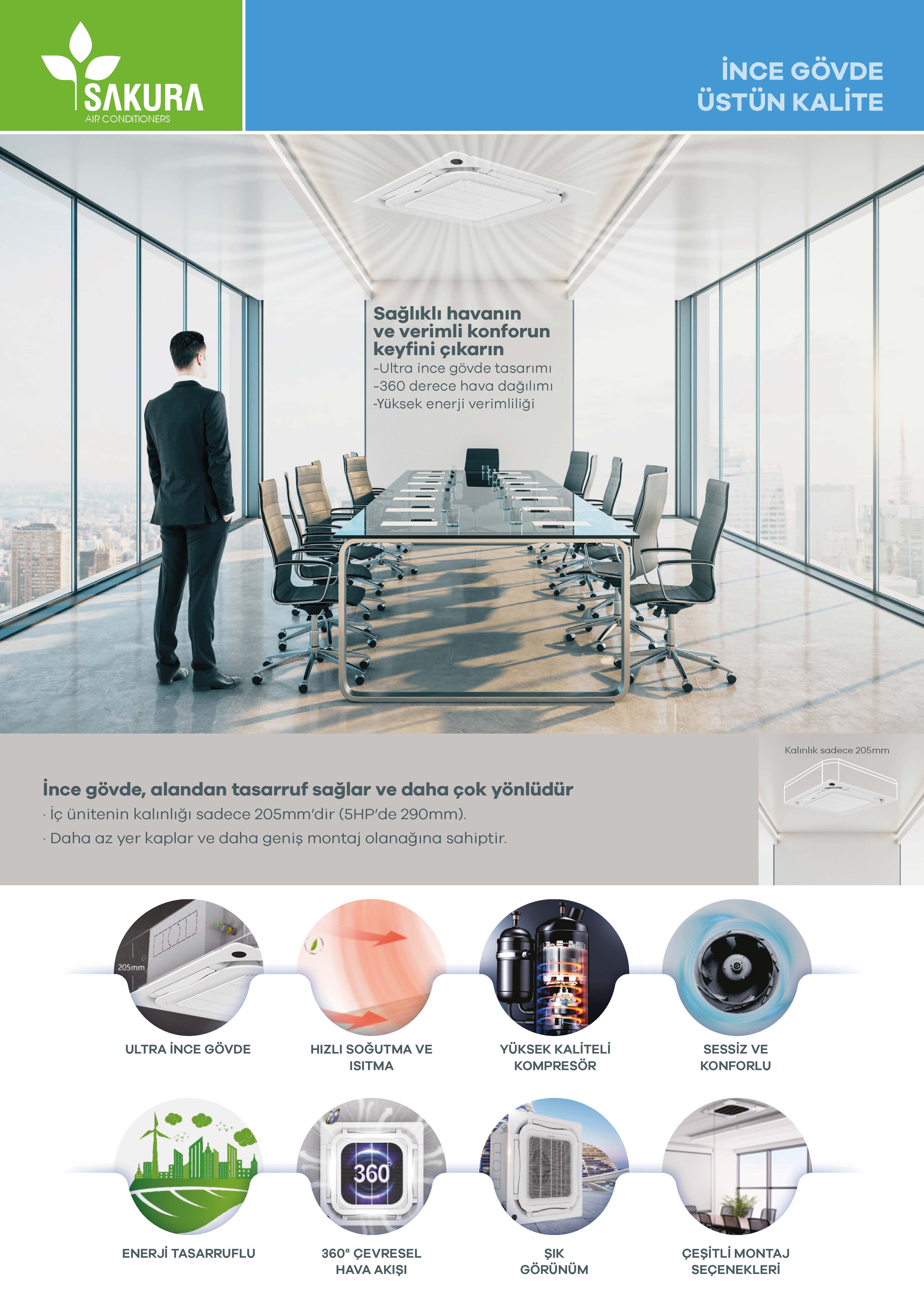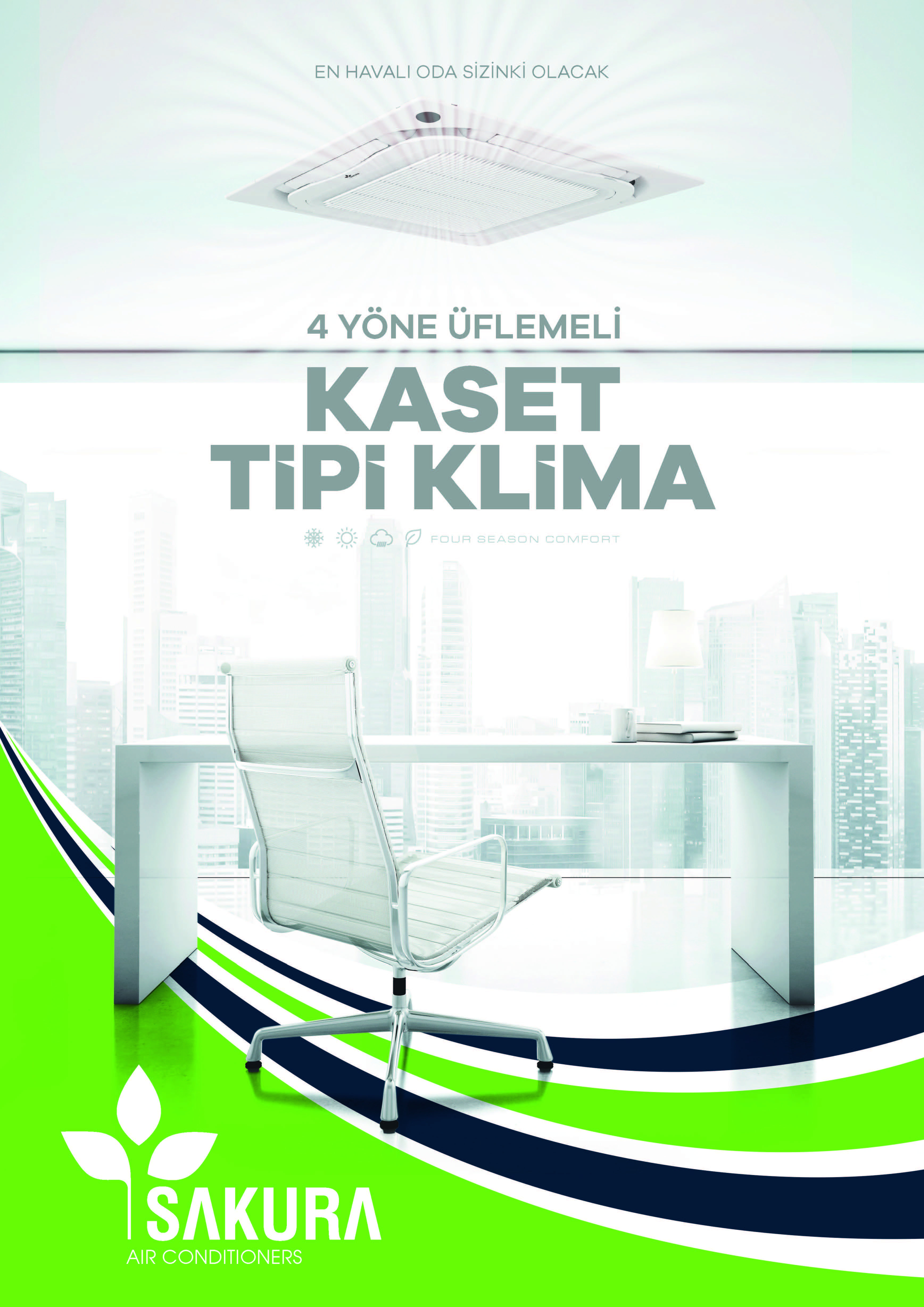Kaset tipi klimalar, özellikle ticari işletmeler, ofisler, alışveriş merkezleri ve restoran gibi büyük ve yoğun alanlarda tercih edilen profesyonel iklimlendirme çözümlerindendir. Tavan arasına gizlenerek monte edilen iç üniteleri sayesinde mekân estetiğini bozmadan hava dağılımı sağlar. 360 derece üfleme özelliği ile ortamın her köşesine eşit derecede hava akışı sunar. Hem yazın serinletici, hem kışın ısıtıcı özelliği ile dört mevsim kullanılabilir. Enerji tasarruflu inverter teknolojileri ve gelişmiş filtreleme sistemleri sayesinde sağlıklı, verimli ve konforlu bir kullanım deneyimi sunar.